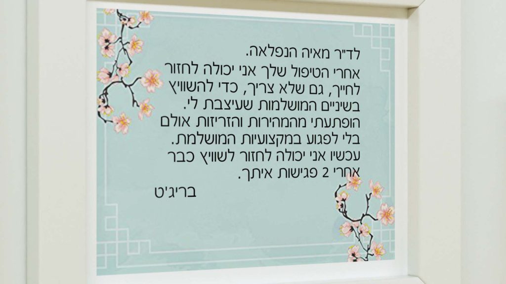 התאמת החיוך היא לא רק להיבטים החזותיים של הפנים אלא גם לאופיו של המטופל, כך שהתוצאה תשקף את רצונו באופן מיטבי. טיפול ציפוי שיניים בקליניקה שלנו מתבצע בשילוב טכניקות שונות ליצירת תוצאה אופטימלית. גם אם מדובר על יישור שיניים בשילוב הלבנת שיניים וציפויי חרסינה תוכלו להיות בטוחים שהטיפול בקליניקה של ד"ר מאיה בן צבי הינו ברמה הגבוהה ביותר בישראל.